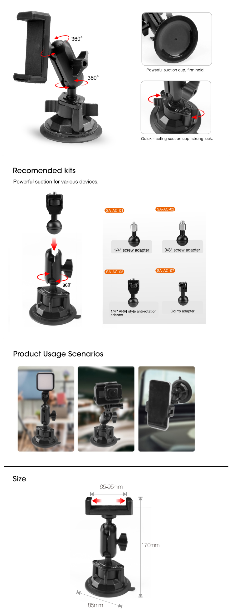 The SHM-20 suction cup mounting kit is a versatile and practical filming accessory. It comes with a robust suction cup, which provides a strong and stable hold, along with four distinct adapters. These adapters offer great flexibility, allowing you to easily attach a wide array of devices. Whether a mobile phone , an action camera for capturing exciting moments, a monitor for real - time preview, an LED video light to illuminate your scenes, or a microphone for clear audio recording, this kit has you covered.