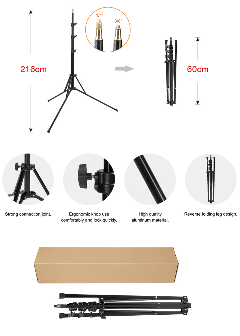 The LS02 light stand features a design that can be folded down to 60cm, making it easy to carry anywhere. Also, the extendable base leg can keep it in balance even if placed on uneven ground. It is made out of high quality aluminum material, a precise surface finish, and has quick locking capabilities.
