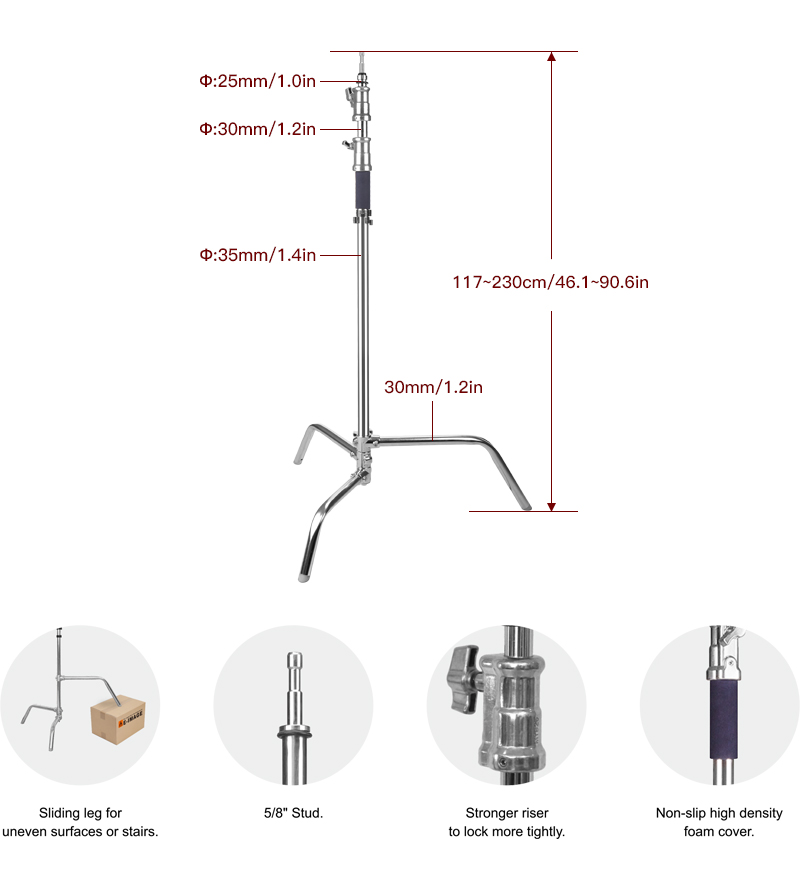 E-IMAGE LCS-S30SD C-stand support with two risers and three sections that fully extend to a height of 230cm. A 5/8" stud on the top can mount grip head or other accessories. This chrome-finish sliding leg model has a movable top leg designed for leveling the stand on uneven surfaces like stairs or curbs.