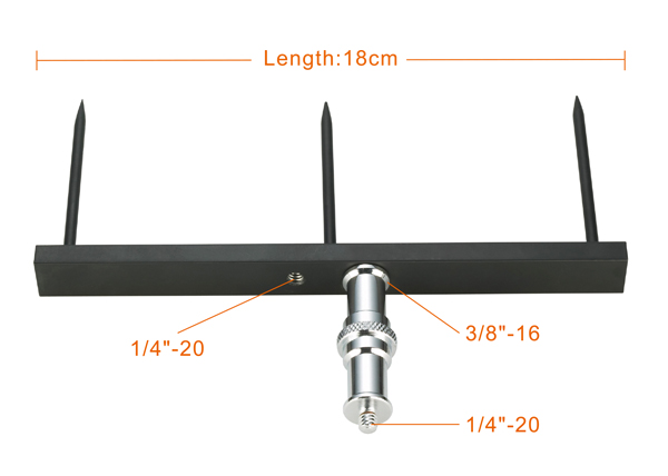 E-IMAGE F-001 Foamcore Fork with 1/4" male to 3/8" male adapter has three tines to pierce and hold a sheet of foamcore, then mount it to any accessory such as a clamp with 1/4" or 3/8" screw hole.