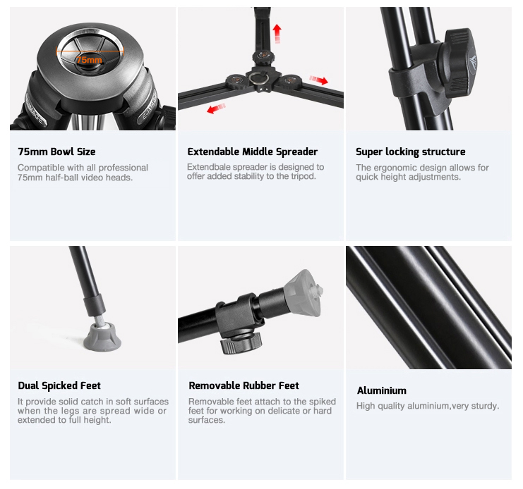 The AT610 is a lightweight aluminum 2-stage tripod, with 75mm bowl size, working height range 60-148cm. The adjustable middle spreader aids in quickly setting the tripod up onl level or uneven surfaces. The rubber foot can be changed to spike foot, for working on different grounds. Special design make the folded tripod compact, padded carrying case is included.