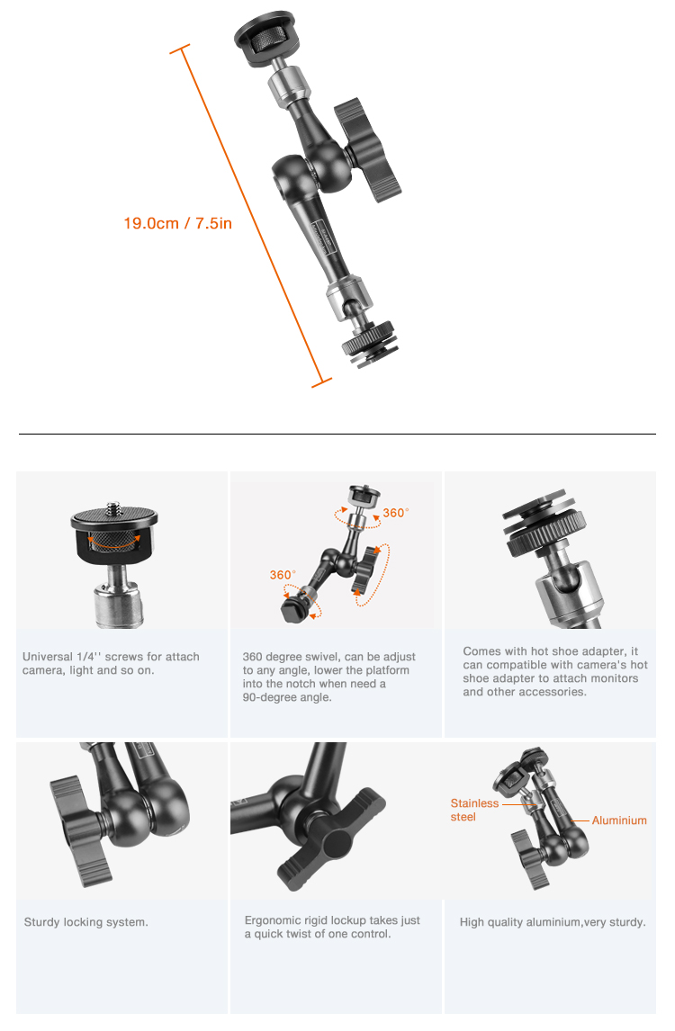 It features with 1/4"-20 knobs on both ends which can be mounting monitor, LED light, flash and other accessories. The screw wheel provides quick attaching and fast release.