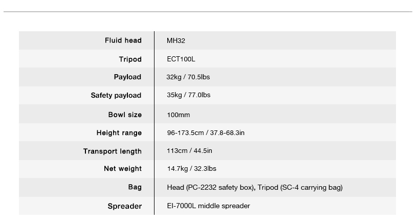 E-IMAGE Heavy Duty carbon fiber Tripod Legs ECT100L with new designed fluid head MH32 supports cameras and accessories weighing up to 32kg(70.5lbs), with EI-7000L middle spreader and rubber feet. The head and legs feature a 100mm bowl. The tripod extends to a height of 173.5cm and collapses down as low as 96cm. It can provides precise adjustment and wide application for different cameras.