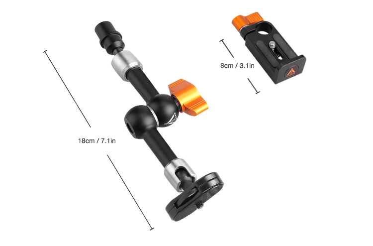 7 inch arms and APM01 plate, it is designed perfectly for mounting monitors, LED lights, a flash light or any device that accepts a 1/4 inch screw male or 3/8 inch screw female.