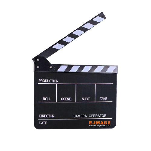 The ECB-01 black clapperboard made of black acrylic designed to be used with dry erase markers. The clapper sticks are made of solid wood for a strong audio spike, and they feature a magnetic lock to keep them closed when not in use. The full slate measures 9.3 x 11" and features engraved text and lines.